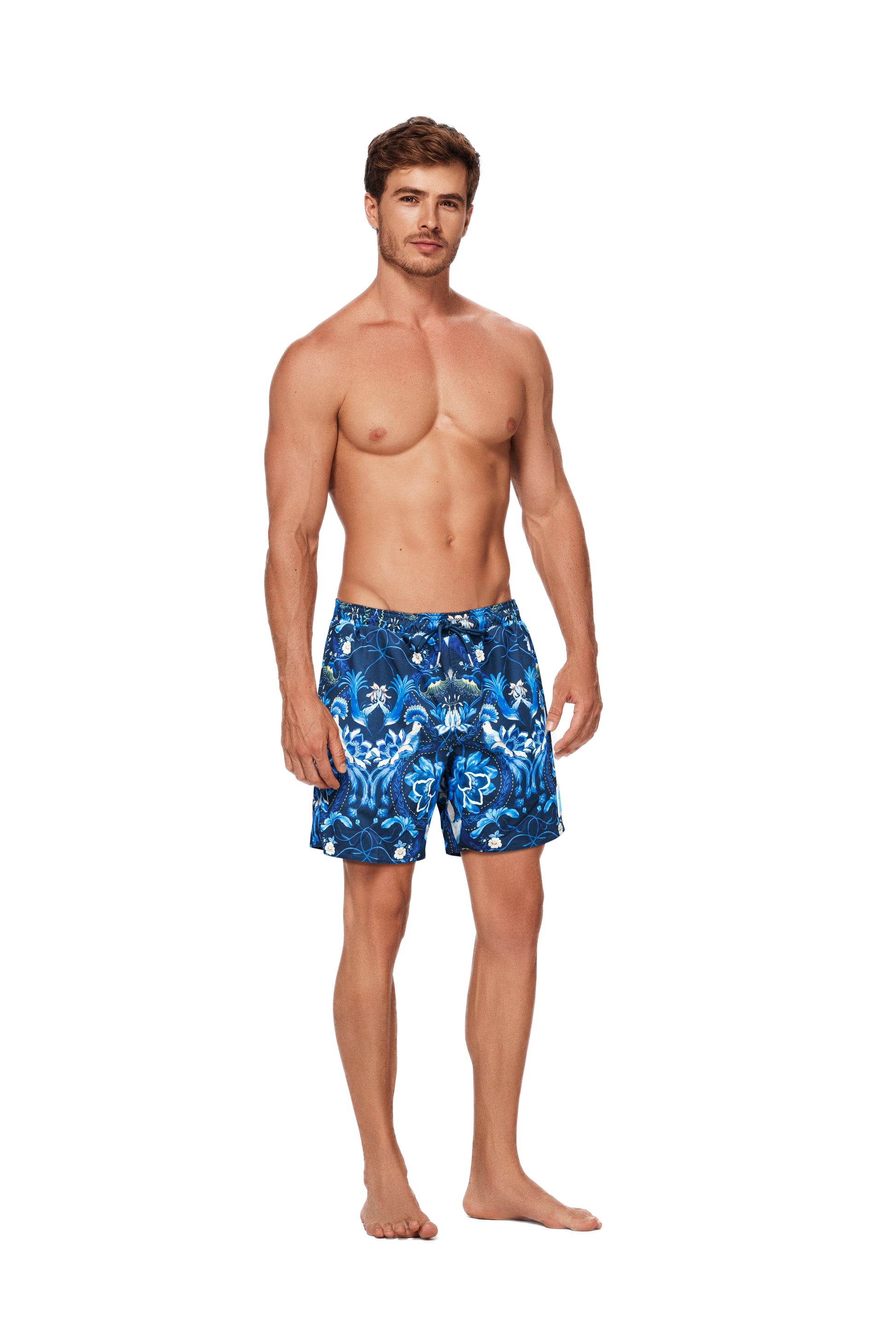 Printed swim trunks.